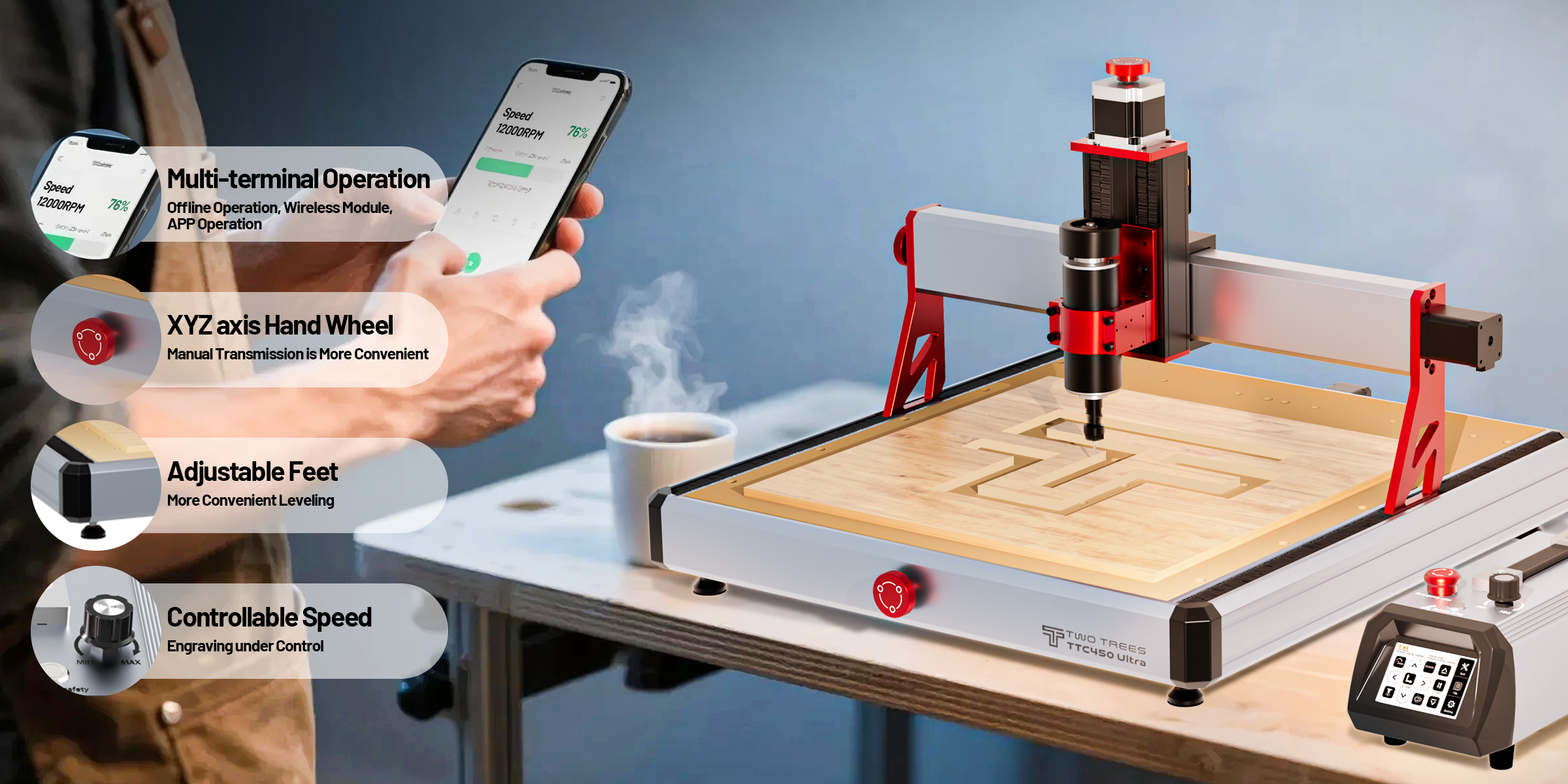 Twotrees TTC450 Ultra CNC Router Machine + 4th Axis + Vacuum Cleaner M1