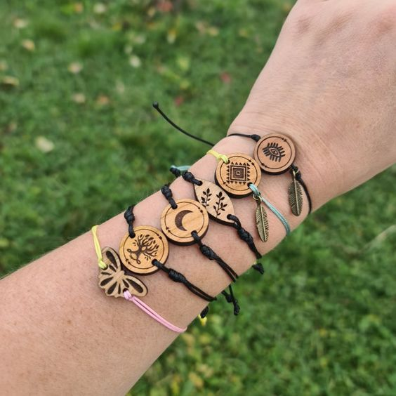 Durante um passeio, levei lascas de madeira gravadas a laser com antecedência, além de cordões e pingentes, para fazer pulseiras com meu filho. Meu filho "enfiou" as flores, a grama e o céu azul do passeio nas pulseiras. Agora, usando-as, levantar a mão é como reviver a beleza do passeio — tão divertido!