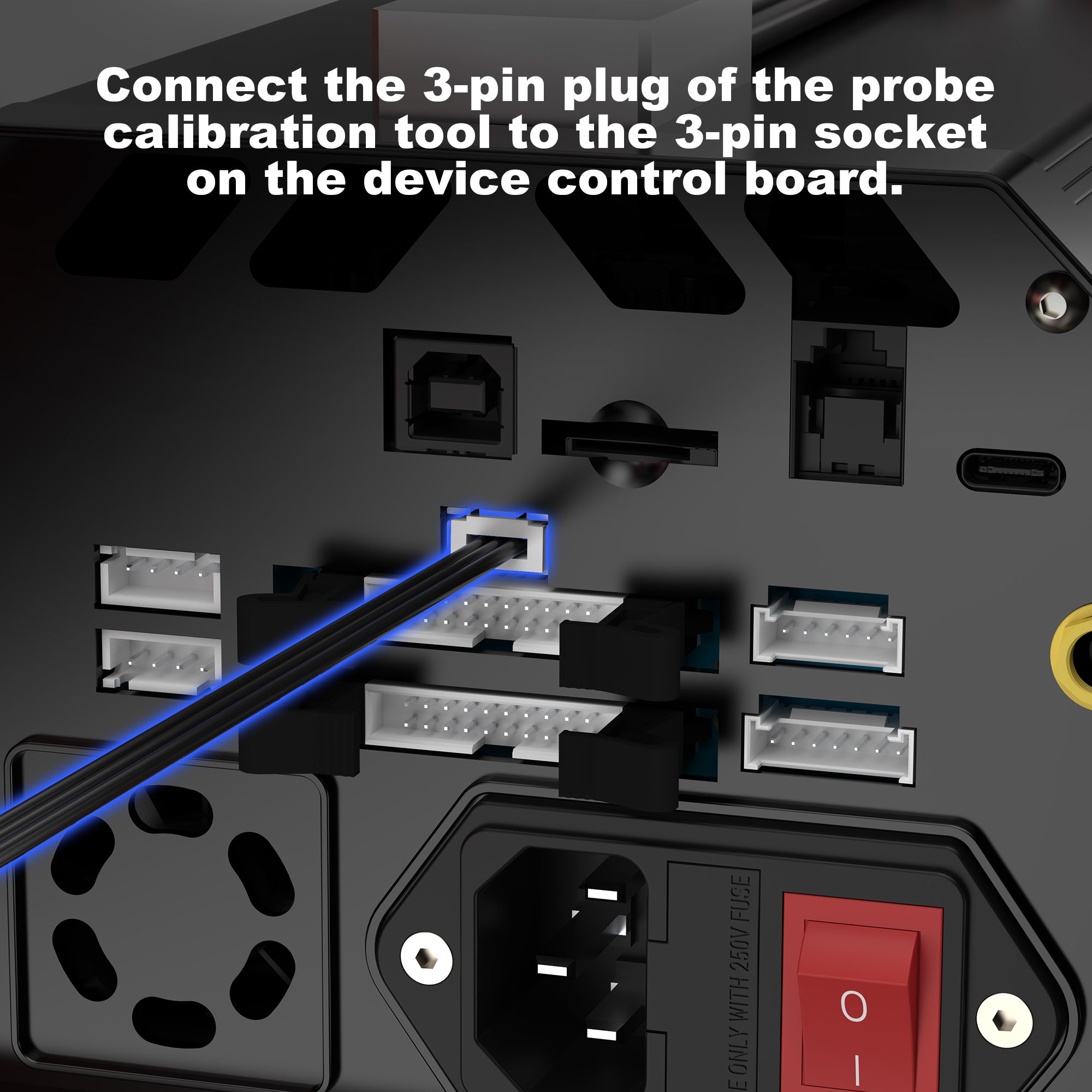 Connect the 3-pin plug of the probe calibration tool to the 3-pin socket on the device control board.